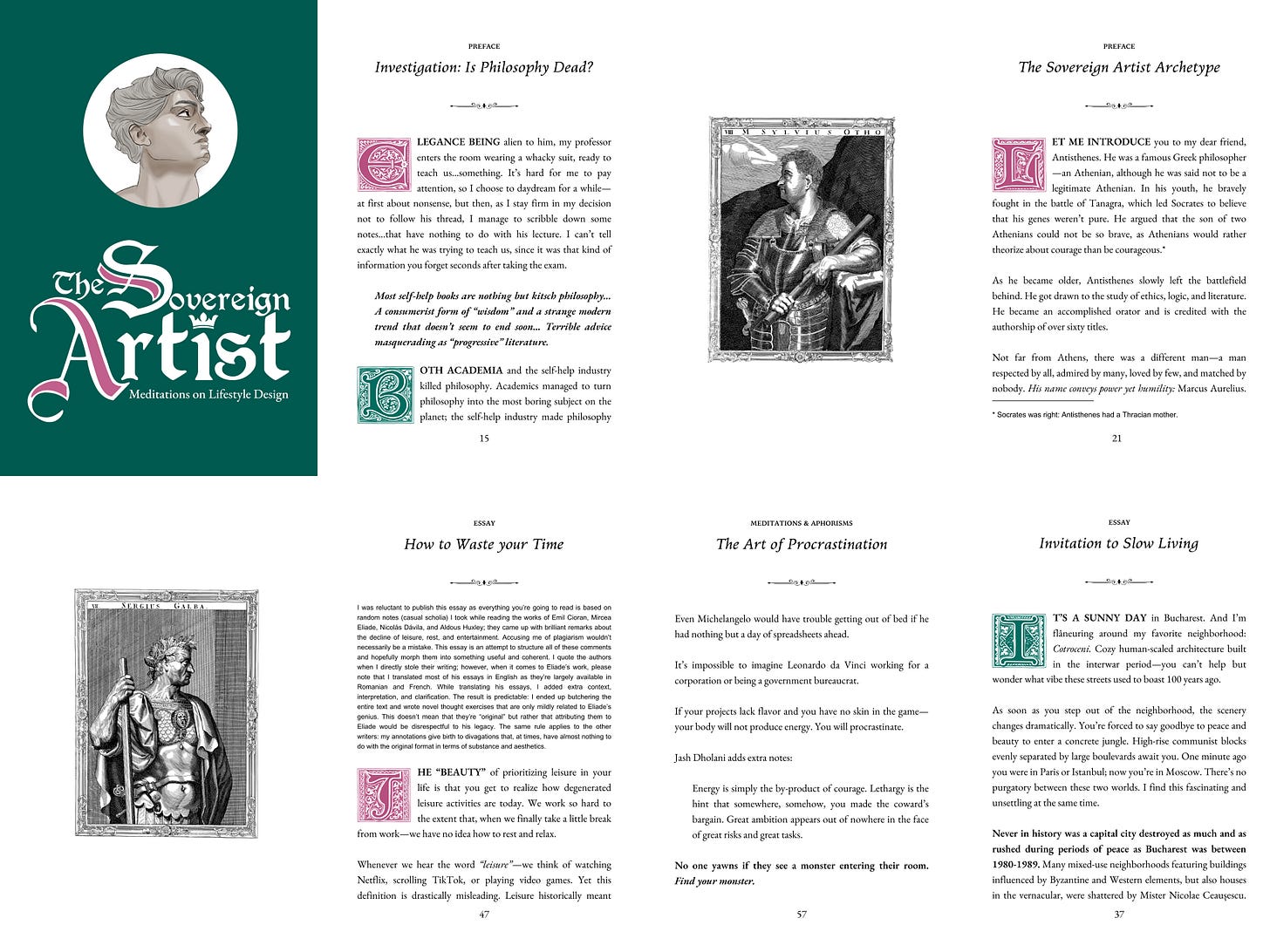 Specialization kills the craft; division of labor dulls your soul; and thus love is neutralized. I recall with great satisfaction the days when I worked on publishing my 1st book—The Sovereign Artist—and how everything felt like play. As modern books are largely ugly, I decided to take care of the entire process from start to finish (strategy, research, writing, editing, design, visuals) except for the cover. Nassim Taleb is right; authors get to act like artisans by writing while typesetting. Many writers rely on a few researchers to help them write their books; then they hire an editor, of course a publisher, maybe a designer, a visual artist, some consultants, and so on.5 The creative process gets very efficient and thus no longer creative, as efficiency is precisely what you want to avoid in all arts and crafts.6 If your goal is to turn artists into workers, focus on separating them from their final product.7